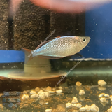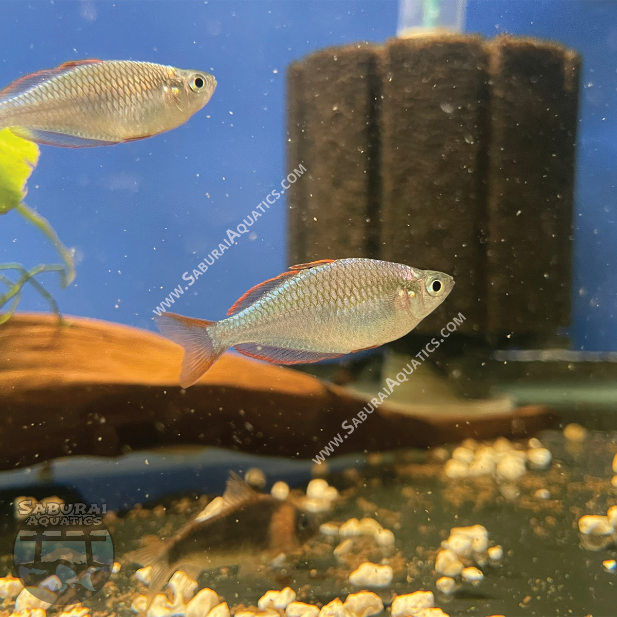 The Dwarf Neon Rainbow, sometimes referred to as the Praecox Rainbow, is one of the more popular species of rainbowfish. It is considered a dwarf species, as it reaches around 3" max size. This allows for much more flexibility in tank sizes. Its striking blue coloration contrasting with the bright red fins distinguishes this fish, along with its unique football shaped body.